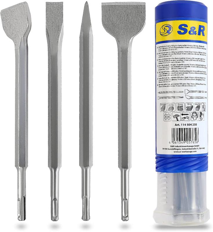 S&R Meister Mejsel SDS Plus Set 4-delar - för kakel, betong, sten, murverk, puts, med mera - 1 x spetsmejsel, 1 x plattmejsel, 2 x klinkermejsel - vinklade och raka