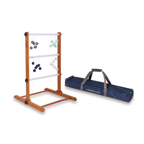 Uber Games Ladder Golf Playset – högkvalitativt stege trädgårdsspel i gummiträ – 12 Bolas-bollar i äkta guld och bärväska och förvaringsväska av segelduk