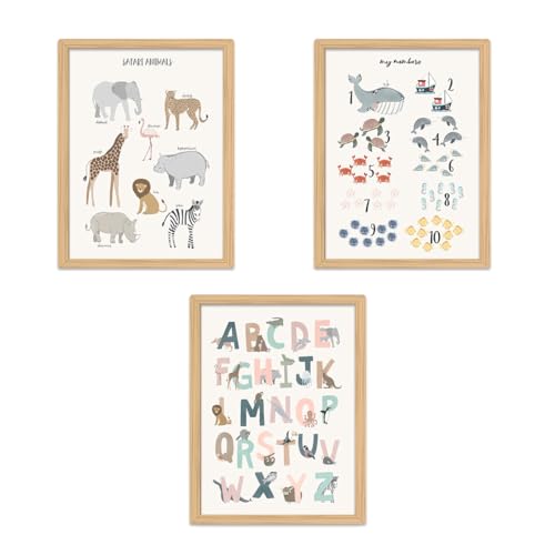 Zamety Set med 3 bilder barnrum, A4-affischer barnrum, segelduk bilder bebisrum, ABC affisch för barn, alfabet siffror djur läroaffisch för dagis, utan bildram