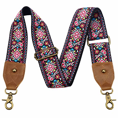 Nefelibata bred axelrem, galen hästläder justerbar ersättning för portmonnäremmar, axelväska av segelduk med flera mönster, handväskebälte, Rött broderi, Large, Retro