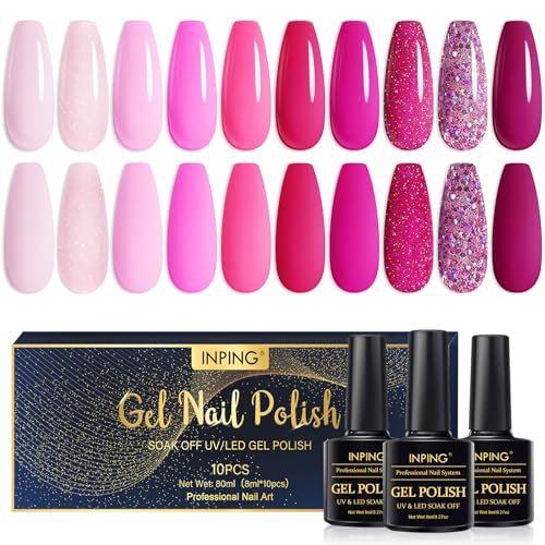 INPING Semi-permanent lack, 10 Fuchsia färger ljusrosa mörkrosa paljetter nagellack semi-permanent UV gel, för nybörjare DIY presenter nagelkonst, 8 ml