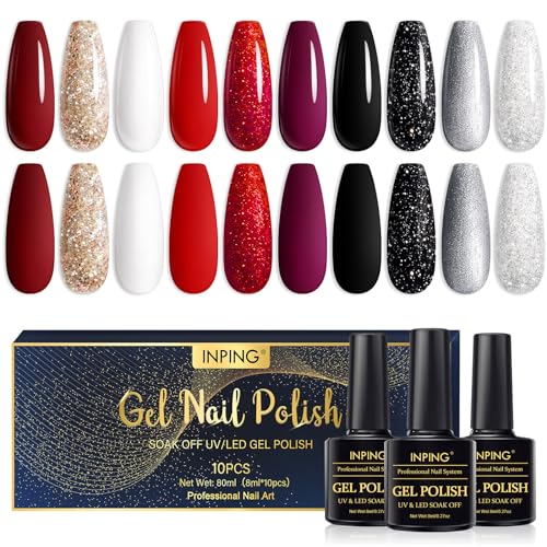 INPING Semi-permanent emalj, 10 färger röd svart guld silver svart glänsande nagellack UV-gel guld silver glänsande på vintern halloween jul present gör-det-själv 8 ml