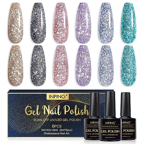 INPING Semi-permanent nagellack i glittrig pastell, 6 ljusa färger halvpermanent gel UV. Guld, silver, grön, lila, rosa och svart för fransk manikyr. Höst och vinter-kit gör-det-själv. 8 ml.