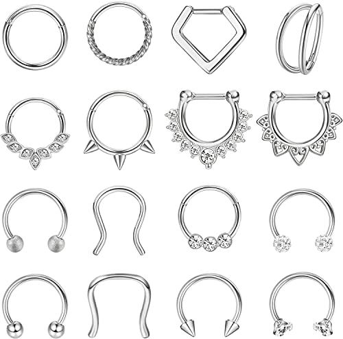 Adramata 16 Stycken Septum Ringar 16G Hästsko i Rostfritt Stål - Daith Örhängen, Näsringar, Hoop CZ Brosk Helix Tragus Piercing Smycken 8 mm