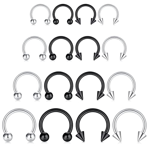 Yolev Horsesho-ringar, kirurgiskt stål, 16 G, olika storlekar, näsringar, septum, hästsko, ögonbryn, läppring, hästsko, för kvinnor och män, svart/silver, rostfritt stål