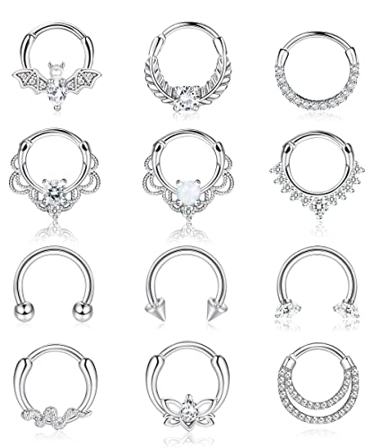 Adramata 12 Stycken 16g Septum och Näsring Set i Kirurgiskt Stål - Brosk Piercing med CZ Opal för Daith och Helix - Örhänge Smycken