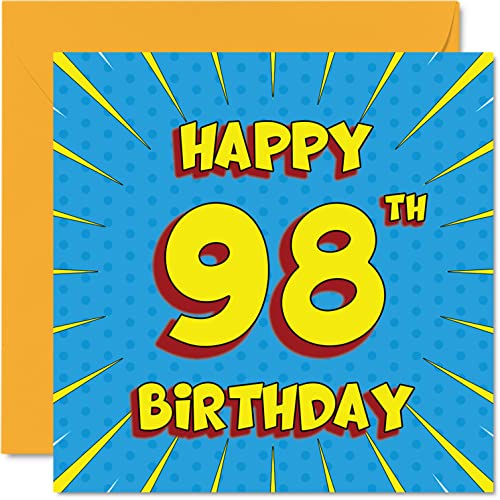 Roliga 98-årsfödelsedagskort för män kvinnor – serietidning – grattis på födelsedagskort för mormor farfar farfar barnflicka mamma pappa mormor, 145 mm x 145 mm gratulationskort, 98:e födelsedagskort