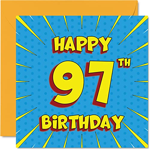 Roliga 97:e födelsedagskort för män kvinnor – serietidning – grattis på födelsedagskort för mormor farfar farfar barnflicka mamma pappa mormor, 145 mm x 145 mm gratulationskort, 97:e födelsedagskort