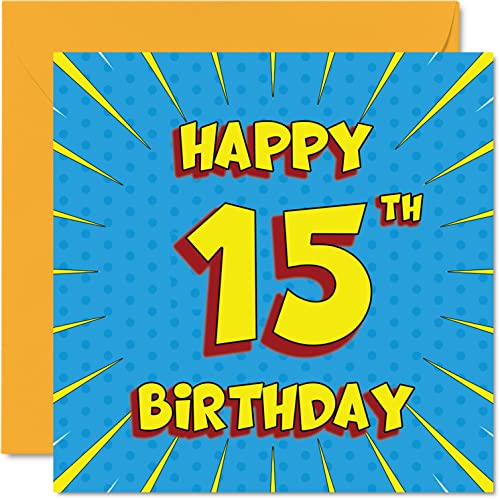 Roliga 15:e födelsedagskort för pojkar flickor – serietidning – grattis på födelsedagskort för syster barnbarn son dotter bror kusin brorson brorsdotter, 145 mm x 145 mm gratulationskort, 15:e