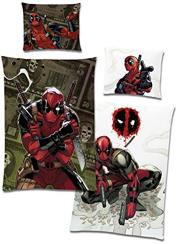 BERONAGE Deadpool Vändbara sängkläder vitgrön 135 x 200 cm 80 x 80 cm, 100 % bomull, förstärkt linonkvalitet med YKK-dragkedja anti-hjältemask Marvel serietidning barnsängkläder tysk storlek