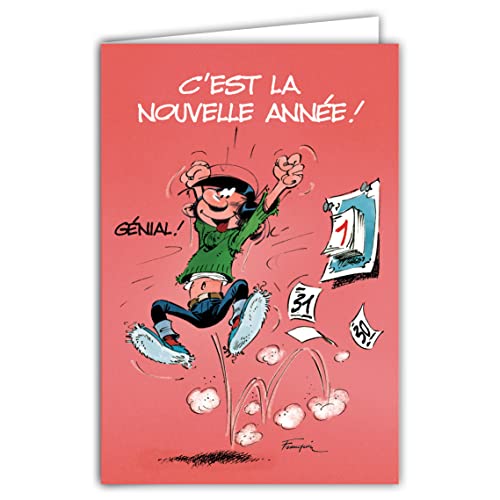 GASTON LAGAFFE Kort Bästa hälsningar för det nya året kalender 31 december 1 januari illustration humoristisk teckning belgisk humor serietidning Franquin papper PEFC AFIE XGL 002 BA