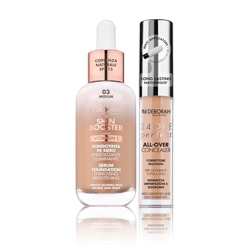 Deborah Milano-Set Serum Skin Booster Foundation SPF 15, 4 Medium Beige, med C-vitamin, naturlig effekt, 30 ml och vätskeconcealer, 24 timmar, perfekt allt-över, 5 Amber, lång vattentät tätning, 5,5 g