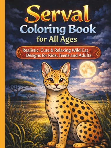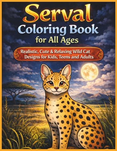 Serval Coloring Book for All Ages: Realistic, Cute & Relaxing Wild Cat Designs for Kids, Teens and Adults: 50 Detailed and Easy-to-Color Pages ... Stress Relief and Fun Wildlife Learning
