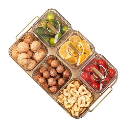 Serveringsbricka med handtag, mellanmålsförvaringslåda i plast, förrättsbricka för fest, 6 genomskinliga avtagbara fack för torkad frukt, godis, nötter, kakor, frukt