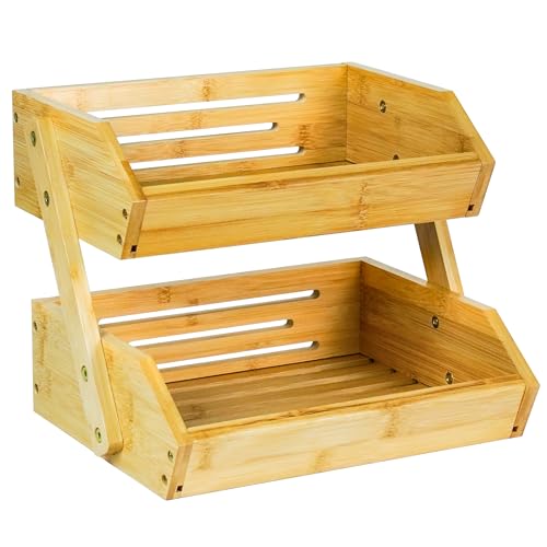 AdelDream Fruktställ i bambu med 2-våningar, serveringskorg, fruktskål, mellanmålsställ, perfekt för frukt och grönsaker, snacks eller hushållsartiklar (fruktkorg i två våningar)