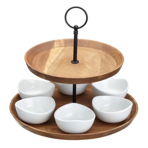 Artesà, serveringsställ med två våningar för trätapas, 2 serveringsplattor med 6 handgjorda mini porslinskålar för antipasti, kakor, skålar, i presentförpackning – brun/svart