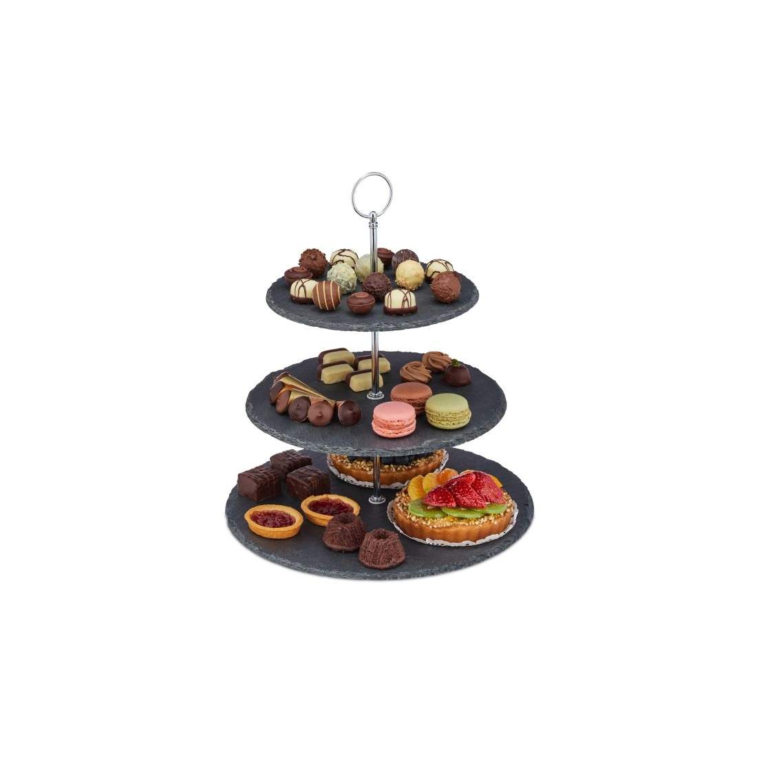 Relaxdays 10030732, 3 nivåer, skiffer, kaka, mellanmål, frukt, metallhandtag, serveringsställ, HxD 34 x 30 cm, antracit/silver, stål
