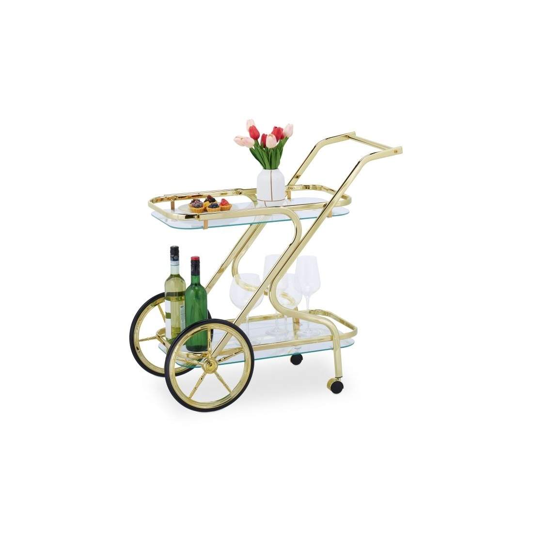 Relaxdays Serveringsvagn, köksvagn med 2 nivåer och flaskhållare, H x B x D: 79 x 45 x 65,5 cm, tillverkad av metall och glas, mässing