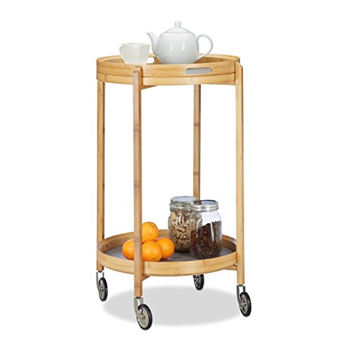 Relaxdays bambu serveringsvagn, rund vagn med serveringsbricka, 2-lager, 4 hjul, 80 cm lång, Ø 45 cm, naturlig/grå