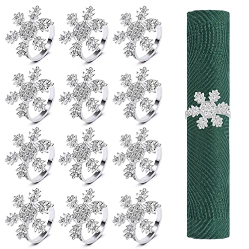 KAHEIGN 12 st jul servettringar, silver snöflinga servetthållare jul servetthållare med strass för jul lunch Thanksgiving fest semester bröllop bordsdekoration (4,5 cm x 4,5 cm)