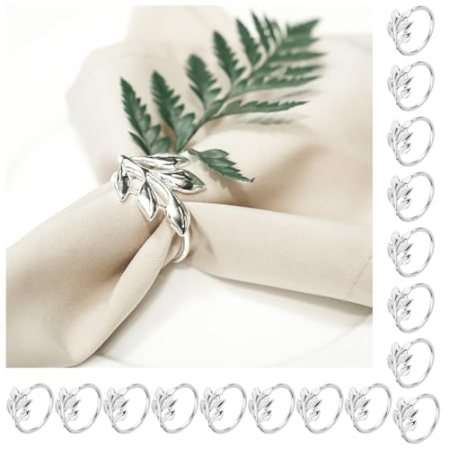 AILUYA Servettringar i silverfärgad metall, 16 stycken servettspännen, servetthållare med bladmotiv, eleganta servettringar för bröllopsfest, familjemiddag, påsk och bordsdekoration