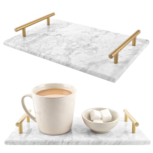 Oungy Serveringsfat i marmor med handtag, dekorativ serveringsbricka, rektangulär tablett för kök och badrum, förlovningstablett, 30 x 20 x 4,5 cm (grå)