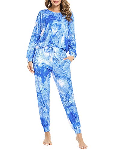 Doaraha Pyjamas Kvinnor Vinter Bomull Lång Tie Dye 2 stycken Sexig Raffinerad Rund Hals Nattskjortor och Comfort S-XXL, Blå Tie-dye, S