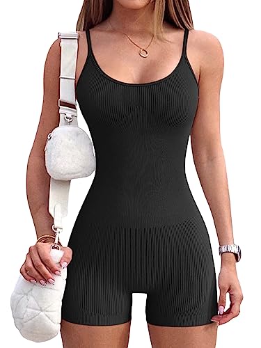 Rongseng Jumpsuit för kvinnor kort sport ärmlös spaghettirem sexig ledig elegant jumpsuit elastisk ribbad tank topp, svart, M