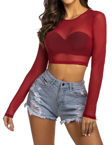 Avidlove damer basic topp sexig blus crop skjorta festival toppar rave outfit långärmad klubbkläder, Vinröd, M