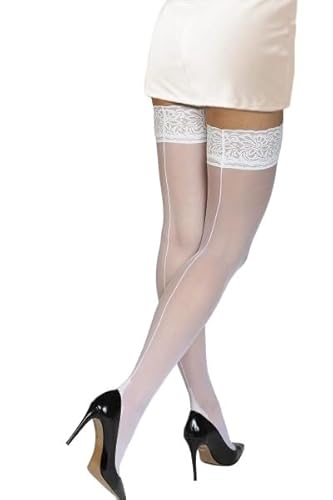 Annes styling Hold ups dam med ryggsöm 20 denier sensuella strumpor sexig spets topp hög lår med silikon, vit, M/L