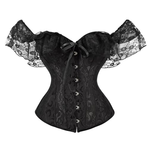 Cazqgoy Korsett för damer, bustier, sexig spetskorsett, topp, vintage, snörkorsett, formande korsett-topp med ärmar som faller över axlarna, linne med spets, svart, XXL