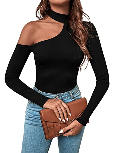 GORGLITTER Sexig långärmad tröja för kvinnor, t-shirt med asymmetrisk krage, axellös topp, långärmad, svart, L
