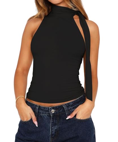 Navneet Neckholder topp damer party Y2K crop toppar en axel ärmlös sommar sexig topp festival, Svart ärmlös, S