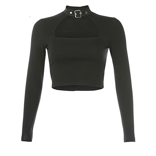 Streetwear Gothic Choker Grimma T-shirt Crop Tops Cut Out Sexig Långärmad T-shirt Dam Bomull Topp Tee Kläder,Svart,L