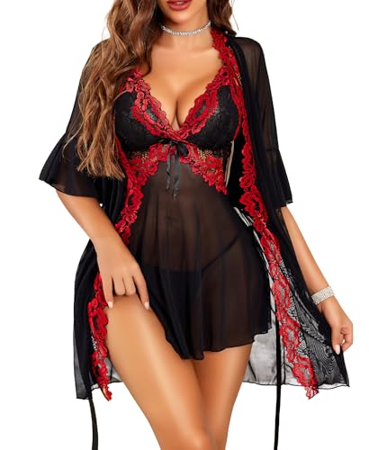 RSLOVE Sexiga underkläder för kvinnor, spetsnattlinne med morgonrock, sovkläder, Svart, rött, XL