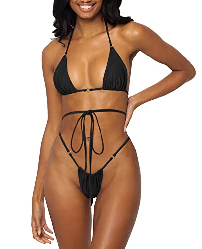 Women's Sexy Micro Thong Bikini Bottom Padded Top Triangle Bikini Bathing Suit(S, Black)