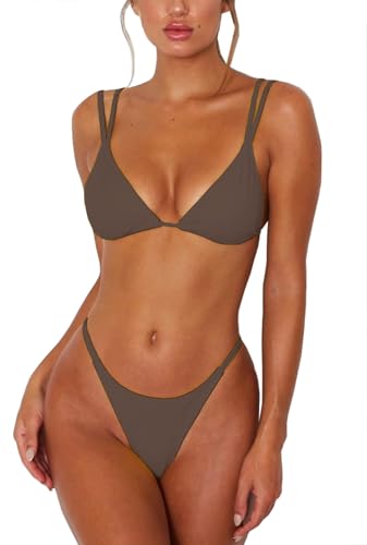 ForBeautyShe Women Coffee Bikini Set Sexy Adjustable Straps Triangle Top High Cut Brazilian Thong Bottom 2PCS Bathing Suit Coffee S