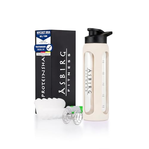 Asbirg Proteinshejkare i Glas 700 ml – BPA-fri, Läckagesäker & Robust – Shaker för Protein med Spiralboll i Borosilikatglas – Dricksflaska för Träning & Sport – Beige