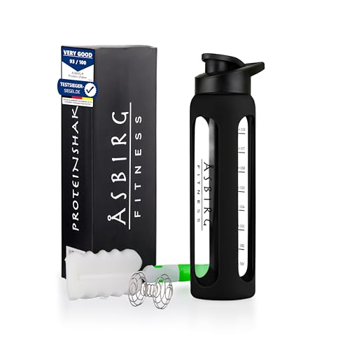Asbirg Proteinshejkare i Glas 1000 ml – BPA-fri, Läckagesäker & Robust – Shaker för Protein med Spiralboll i Borosilikatglas – Dricksflaska för Träning & Sport | Svart