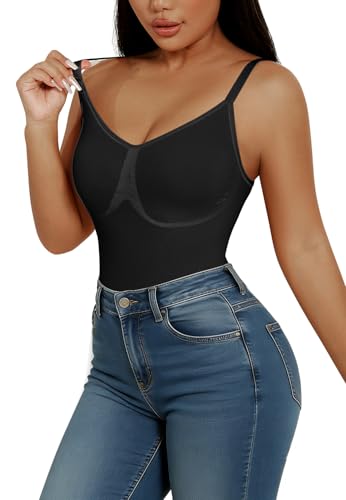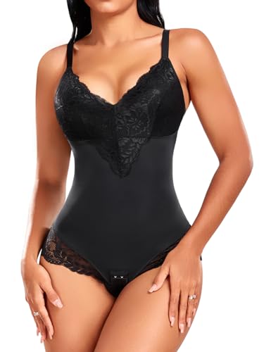 PASUDA Kvinnors skulpterande kroppsformande platt mage osynlig slimmande shapewear bodysuit V-hals justerbara remmar slimmande korsett spaghetti rem spetsunderkläder, svart, M