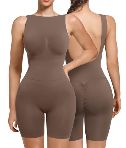 Nebility Womens' Waist Trainer Seamless Round Neck Tummy Control Shapewear Bodysuit (Brown, M/L)