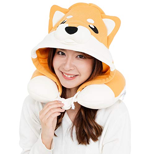 SAZAC djurnackstödskudde – mjuk, mysig resekudde med justerbar växel – fäst huva för värme och integritet – autentisk japansk Kawaii-design – premiumkvalitet (Shiba Inu-hund)