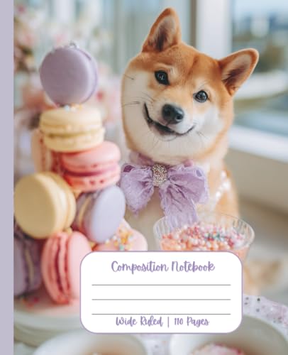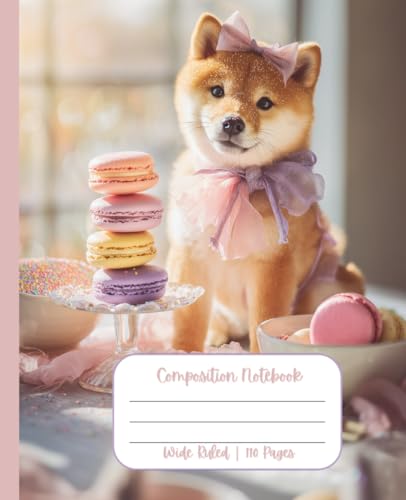 Dog Notebook for Kids Ages 8-12 Wide Ruled Composition Cute Puppy with Bow Journal for Girly Preppy Girls Teens School Supplies Handwriting Middle ... Design Theme Cover Shiba Inu French Macarons