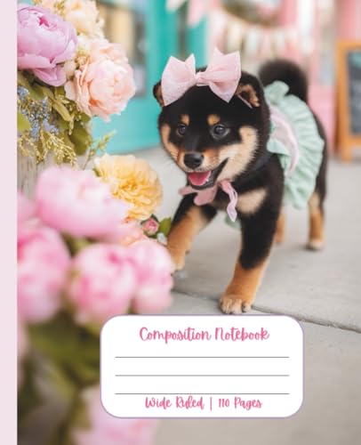 Dog Notebook for Kids Ages 8-12 Wide Ruled Composition Cute Puppy with Bow Journal for Girly Preppy Girls Teens School Supplies Handwriting Middle ... Pink Fun Design Theme Cover Shiba Inu Flowers
