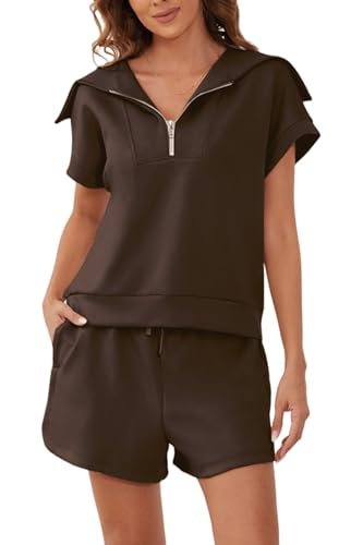 TANMESSO Dam halv dragkedja shorts set två delar sommar sweatsuit vardaglig lounge träningsoverall kläder, Mörkbrunt, S