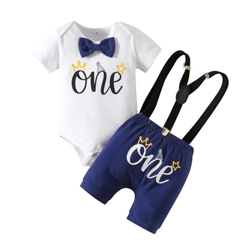 Winmany Bebis pojkar 1:a födelsedagen Outfit Tårta Barn Smash Kläder Kortärmad Sparkdräkt Hängslen Shorts Första Födelsedagen Klädset, Marinblå, 12-18 månader