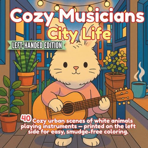 Cozy Musicians: City Life Left-Handed Edition: A City-Themed Animal Coloring Book with 40 Cozy Urban Room Scenes – Cute Bunnies, Cats, Bears and More ... – Relaxing Left-Side Pages for Adults and