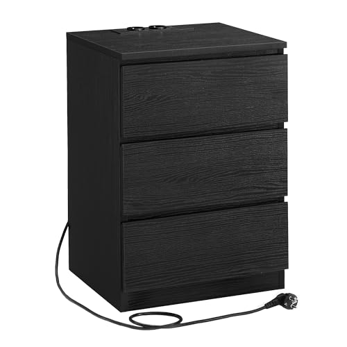 VASAGLE LET631B56 sängbord, sidobord, 3 lådor, fasad kant, 2 AC-uttag, 2 USB-portar, vardagsrum, sovrum, arbetsrum, modernt, ebenholts svart