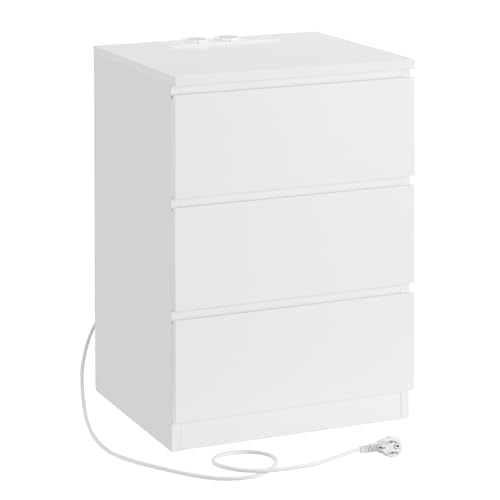 VASAGLE LET631W14 sängbord, sidobord, 3 lådor, fasad kant, 2 AC-uttag, 2 USB-portar, vardagsrum, sovrum, arbetsrum, modernt, molnvit