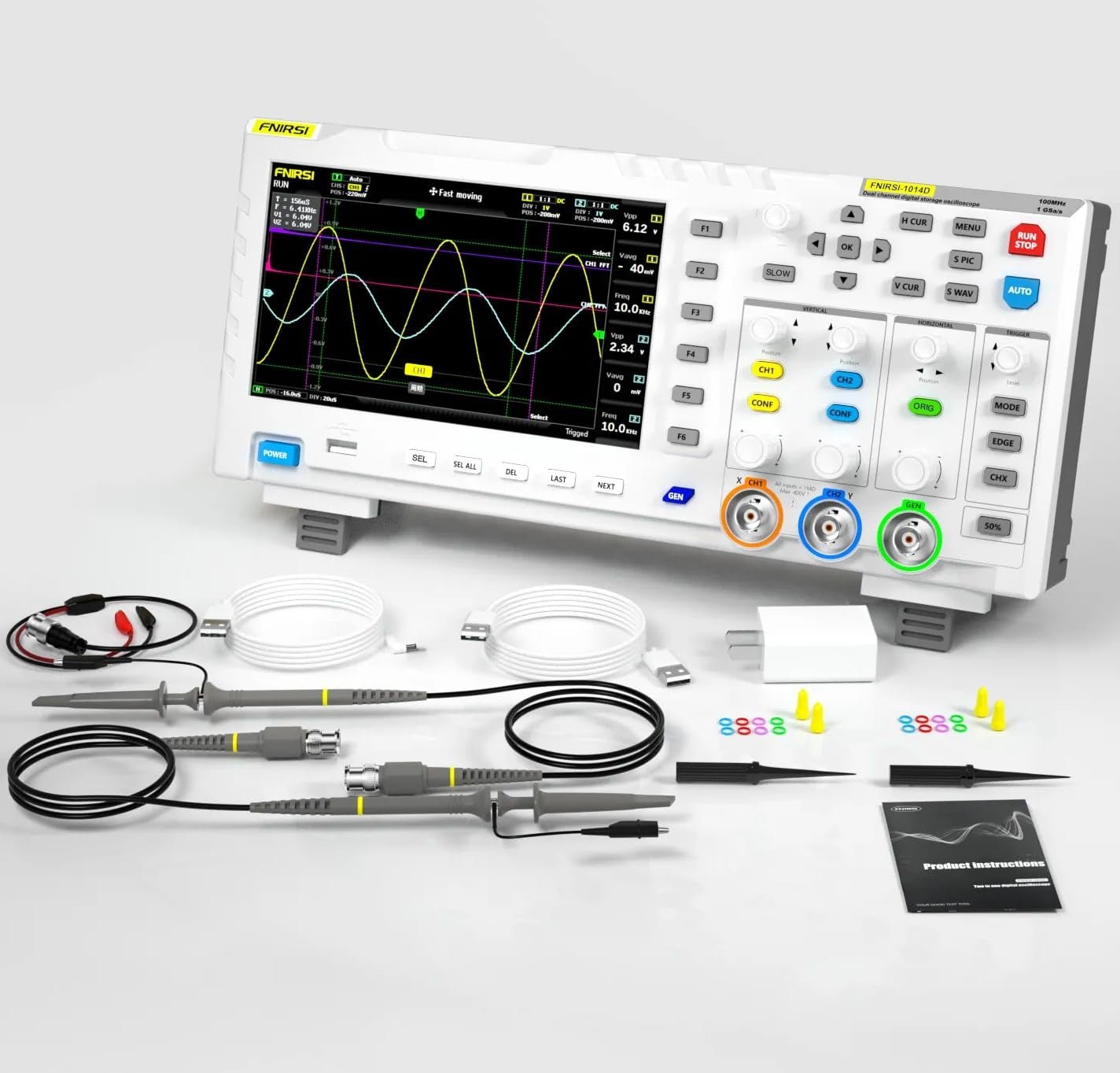 FNIRSI 1014D oscilloskop – 2-i-1 digitalt oscilloskop DDS-signalgenerator, 2 kanaler 100 MHz bandbredd 1GSa/s samplingsfrekvens inbyggt 1 GB lagringsutrymme, 100 x högspänningssond